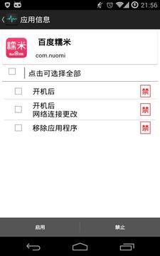 本软件是根据autostarts改进而来,禁止应用开机启动、网络连接时自动启动,我的手机我做主。(需要ROOT权限)