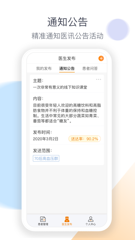 2、告诉通知布告,精准告诉医讯通知布告活动,正常档案,周全把握患者測量数据;