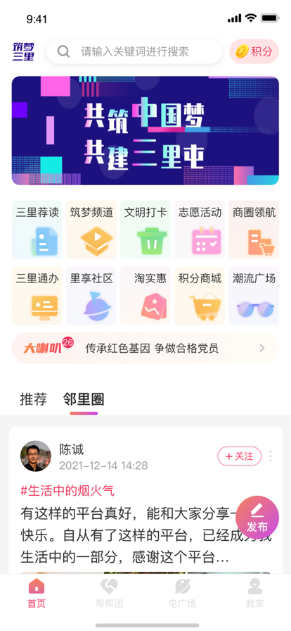 筑梦三里聊天交友APP是专门的社交交友软件,该软件的主要功能是给用户提供全面的社交服务,用户使用起来非常的方便,强大的功能和性能在这块有着非常不错的表现,用户可根据自己的需求来社交,随时可以在线互动聊天,功能齐全,玩法多样,可满足用户的一切社交需求,非常的实用给到用户最完善的使用体验,快来下载试试吧。