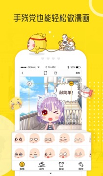 不会绘画也能创作连载漫画,角色,场景、道具全部不用画,手指点点就能完成漫画创作,可以创作插画、4格、条漫和连载漫画,只要你有故事,就能成为漫画家!还有手绘功能可以展示你的大触才能!