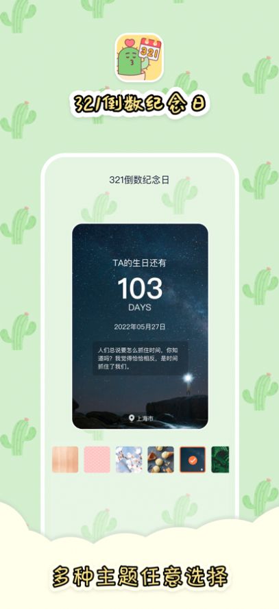 321倒数纪念日苹果版让用户的记录日期有效还准时,不会错过一天的时间来帮助你弥补日期的节日,用户可以很好的掌握日期的时间,这样可以准时过好自己重要的节日了,不过是单身还是恋爱都可以拿来记录时间,非常棒的选择,时间的掌握可以更好的拿捏,功能都非常不错的,记录时间是拿手绝活。