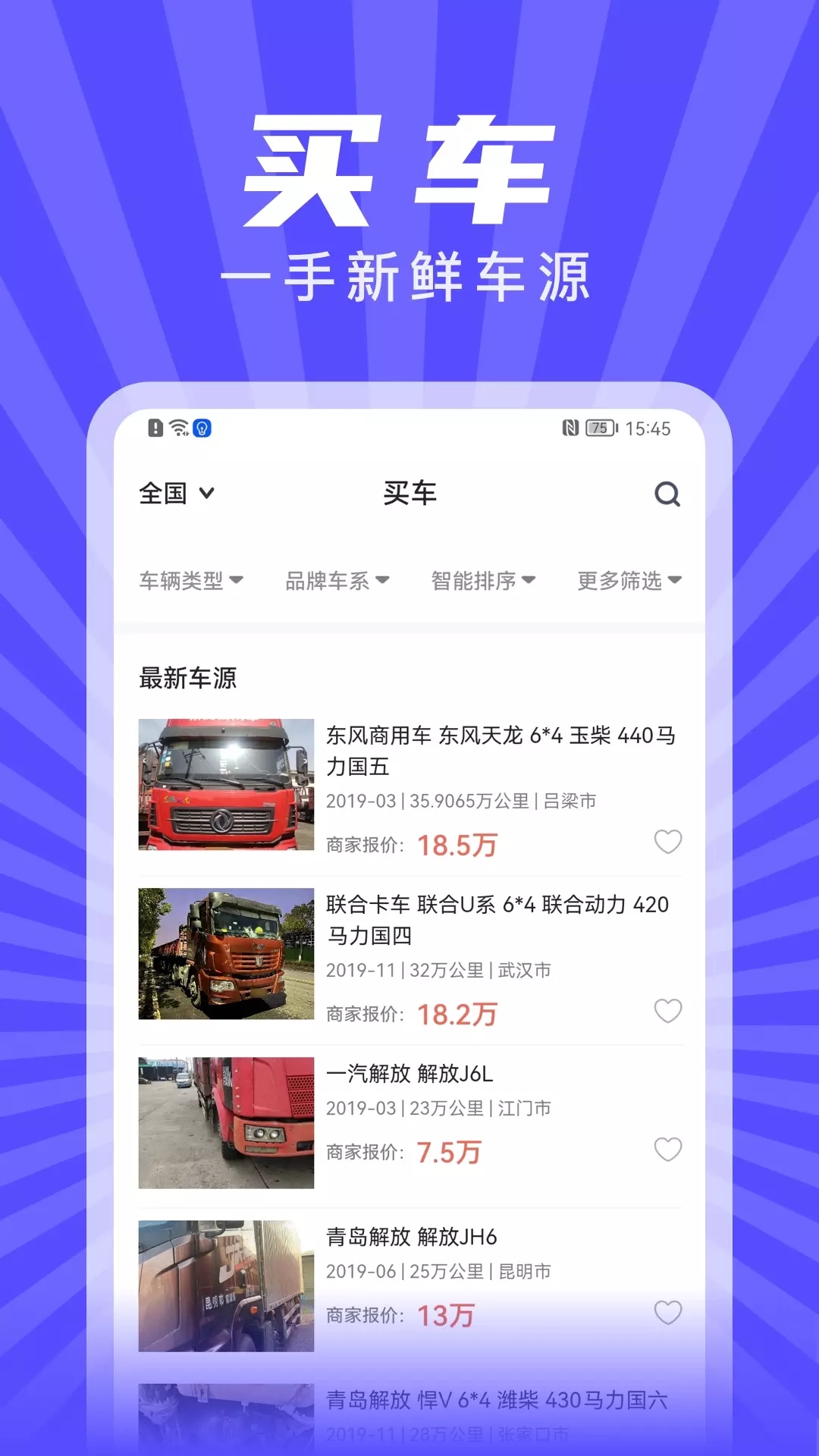 1.大量的车源为你供给,每日最热点的车源信息全数把握在手中,并且软件还开启了进级,加入了珍藏,定阅,砍价等性能.