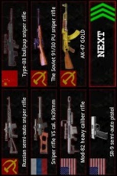一款透过相机镜头当做狙击枪的小游戏。游戏提供各种世界狙击名枪,包括美国的巴雷特M82反器材狙击步枪,现代狙击步枪中射程最长的M200,我国的88式狙击步枪等,游戏还额外提供了诸如AK47,M16甚至Bazooka反坦克火箭筒之类的武器。