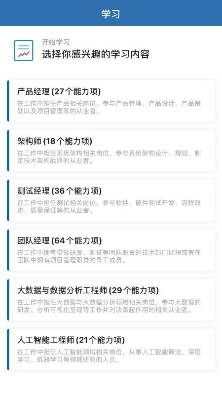 App移动端,预制了独家梳理和制作的,研发团队200+典型工作场景的必备能力项说明以及配套研发经验学习资源