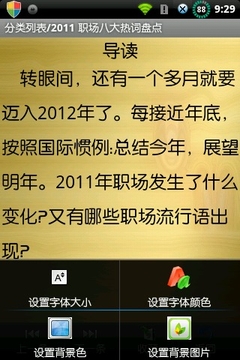 根据您个人阅读习惯,在菜单项“设置字体大小”、“设置字体颜色”、“设置背景色”、“更换背景图片”中设置自己喜欢的字体大小、字体颜色、背景色和背景图片等。