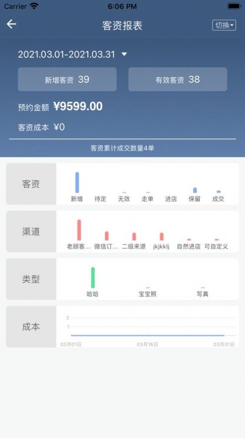 1、影楼老板及管理者可查看影楼此时此刻的订单量、客资量、成交情况、跟进情况