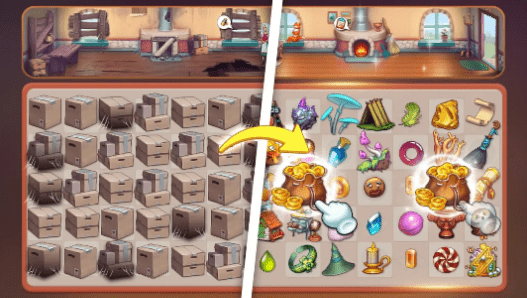合并相似的物品并获得有用的物品和工具来改善和清洁女巫的房子!