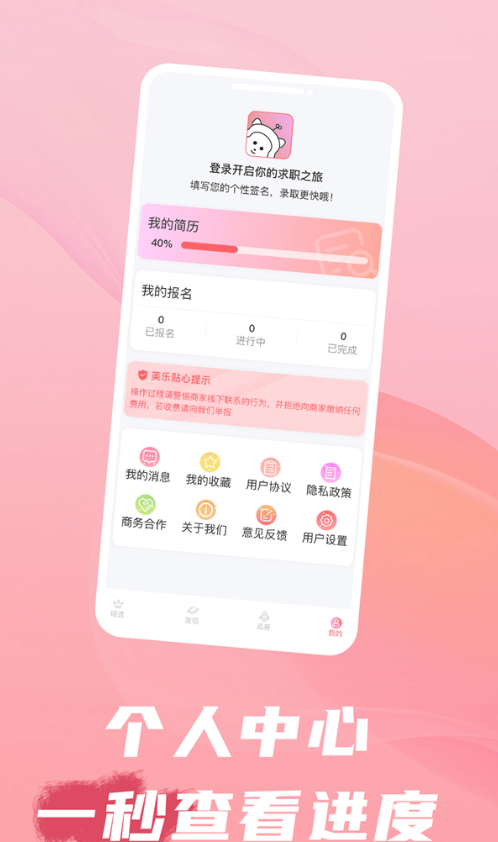 美乐招聘app为用户们带来了极为丰富的招聘信息,涵盖了各种不同类型的工作岗位,能够满足用户们不同的工作需求。平台上所有的招聘信息都是真实可靠的,用户们可以放心向自己心仪的工作投递简历,也可以直接线上与HR交流。同时可以使用软件制作出非常精美的简历,多种简历模板可供用户们免费使用,致力于提升用户们求职的成功率。