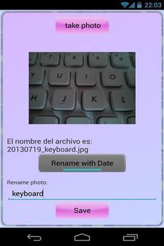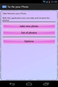 这个应用程序可以拍照和重命名它。这张照片将被保存在以下文件夹:SD /图片/ Trphoto /(日期)。应用程序将被更新和改进。