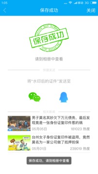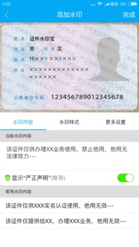 「证件水印宝」可一键给身份证照片加上文字水印,防止他人恶意盗用。