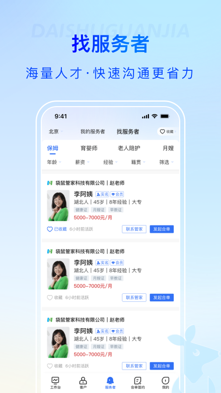 袋鼠管家平台是一款不错的家政管理软件,里面的服务和功能都很不错,一系列的家政服务都可以为你解决,用户的各种家政需求都可以去满足到,属于自己的工作台,找服务者都很简单,简历信息都能详细的查看,信息内容都展示的详细,操作都很简单。
