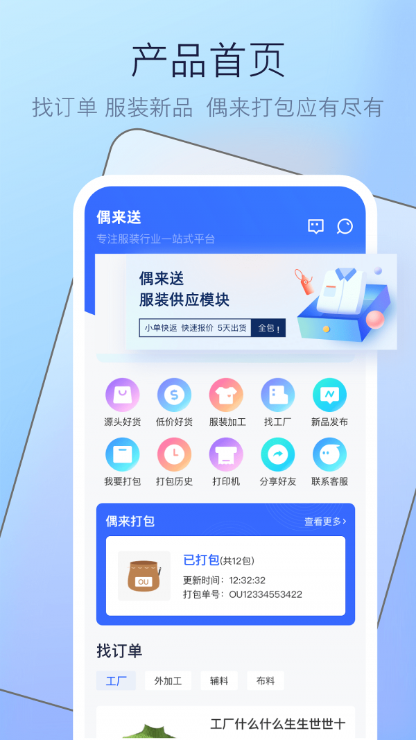 偶来送是一个行业效率办公服务软件,里面的功能都非常的强大,新品和行业的动态信息都可以去查看,订单和工厂都可以轻松的寻找到,订服装新品都非常的方便,功能齐全,服务周全,属于自己的工作平台,订单发布都非常的简单,还可以查看生意圈。