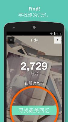 开始你的发现之旅吧! 一旦拥有Tidy,它会帮助你保存美好的记忆。 不想你的记忆淹没在杂乱成堆的照片里……Tidy是你最好的选择。 请试用(免费)后告诉我们你的想法。 *所有的照片都是保存在你的默认相册里。 Tidy 不会擅自保存你的照片。