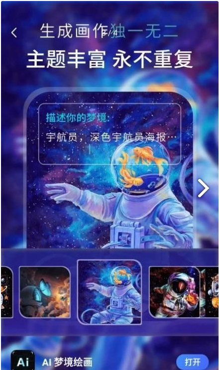 AI梦境绘画是一个高质量绘画服务软件,ai绘画服务可以让你更好的设计绘画,添加各种文字信息都很简单,画品制作完成之后就可以分享给朋友或者社交圈,在这里可以尽情的创作画作,释放你艺术的能力,想绘画什么都可以,里面的素材模板都是免费使用的。