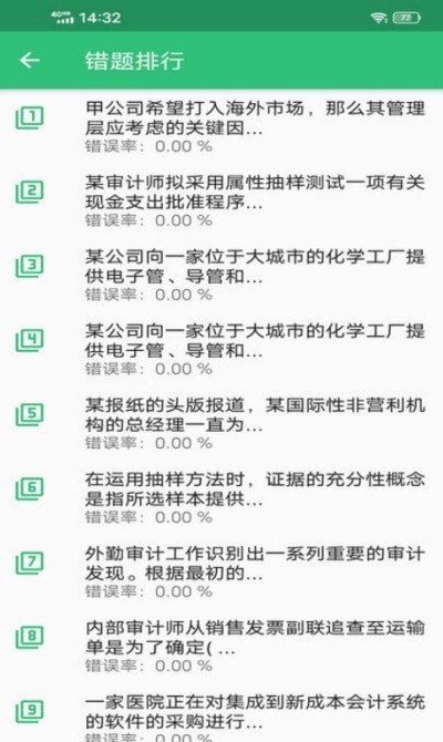 国际注册内部审计师题库app汇集了非常多关于国际注册内部审计师考试的练习题库,包含了历年的考试真题。用户们可以线上刷题来对自己的知识查缺补漏,能够了解考试的重点考点内容。所有的错题也会自动整理在一起,每道题目也都有十分详细的解析,让用户们能够提前做好考试准备,能够轻轻松松通过考试。