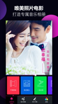 30种炫酷相册模版,海量音乐库,支持1080P导出。对于婚纱照,宝宝照,节日祝福,旅游照,朋友聚会,成长记录,自拍等不同场景提供了针对性主题动效,每个场景的动画根据主题伴随着音乐的节奏来设计。