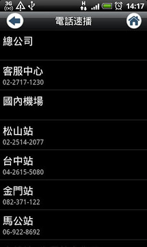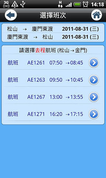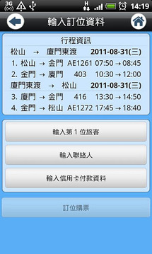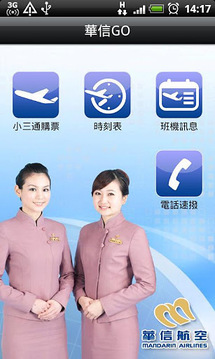 「华信GO」软件为华信航空所提供之手机行动商务服务,除了首创提供线上订购小三通行程外,另外包括班机查询、即时讯息及客服电话等功能,以提供旅客更方便、即时的服务。 小三通购票:提供旅客订购台湾、金门及厦门三地间之小三通订位购票服务。班机查询:提供旅客线上查询航班(含小三通)时刻。即时讯息:提供查询班机相关取消讯息。客服电话:提供台湾地区华信客服及各机场服务电话,点选电话后即可拨出。 mandarin airlines mda ae 快e通 机票 机位 booking ticket