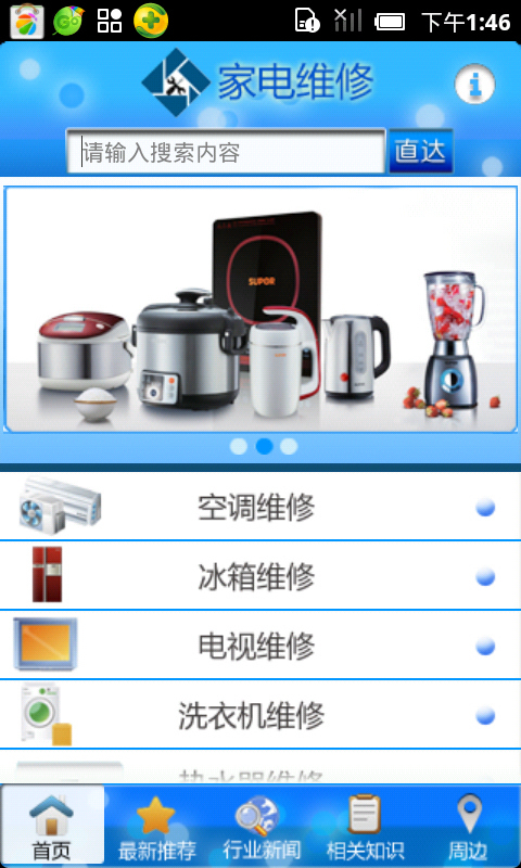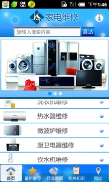 家电维修是一款集各种电器维修咨询,报价的手机客户端,用户可以随时随地了解自己需要维修的电器该去哪里维修,维修价格如何和一些注意事项等多方面信息。该客户端还集成了周边功能,可以让用户查看自己附近的美食店,商城和酒店...