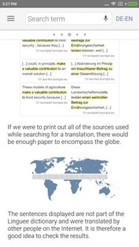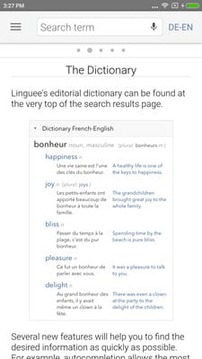 数以百万计用户每天使用Linguee字典。 - 可靠:由超过400词典编纂者创造 - 快速:只输入几个字母就可看到翻译 - 可访问超过十亿条翻译文本 - 词典完全免费,在离线的情况下也可以使用 Linguee是一种新型的词典应用程序。界面特别为Android开发,即使离线你也能够在最短的时间找到可靠的翻译。 西班牙语-英语和其他语言 西班牙语, 法语, 德语, 葡萄牙语和更多语言的词典. 所有词典都是双向的 - 比如你同时可以进行西班牙语 - 英语和英语 - 西班牙语搜索。 多国语言 拥有法语,西班牙语,德语,葡萄牙语的高品质词典。我们同时还提供俄罗斯语,中文,日语,意大利语,荷兰语和波兰语词典。 编辑型词典 我们的编辑词典是由超过400个词典编纂者编纂而成,以为哪怕是最困难的提问提供答案。 离线模式 词典,并随后可以使用,当你没有连接到互联网。这允许您,例如,查找条件,而你是在国外,并没有数据连接。 翻译搜寻 随着集成的翻译搜索引擎的帮助,你还可以使用从Internet超过十亿的翻译。 快速搜索 单词和短语的翻译正在进入只是几个字母后显示。即使是无意的打字错误是智能纠正。