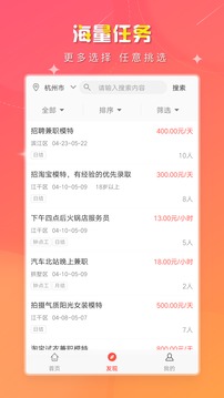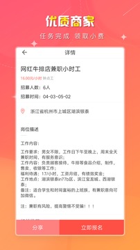 求职方在平台可以进行简历编辑、在线报名、信息浏览、联系商家等操作,可有效利用空闲时间在短时间内打工赚取商家报酬。