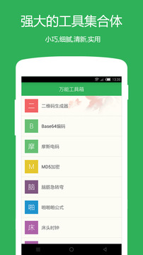 手机万能工具箱主要围绕小巧,细腻,清新,实用来设计编写,包含这些功能:二维码生成器、Base64编码、摩斯电码、MD5加密、海量脑筋急转弯、啪啪啪公式、床头时钟、数字转大写、简体繁体字转换等各种便捷生活实用工具,给你的生活带来便利。希望这些小的功能可以帮助你拥有更好的生活,工作和搞机的体验,2018我们继续搞机。