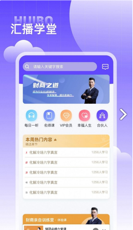汇播学堂app里面汇集了很多的财商课程信息,专业的老师在线讲解,让你对财商有更多的认知,服务非常的好,信息内容比较的丰富,随时可以在线打卡,大部分都是相关的专业知识,学员可以随时在线学习,服务很周全,详细的语音播报,每天都可以学习。