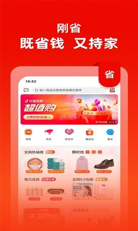 刚省app里面汇集了很多的优质商品,价格都很实惠,一键就可以快速的下单,省钱还省时在这里购物,都是大品牌保障,超多的限时活动可以去参与,还能和自己的朋友进行拼单,购物的玩法也是相当的齐全,每次购物都能节省超多的开支,功能划分详细。