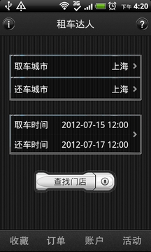 租车达人方便易用,是您的租车首选。特点:1.免费预订租车,同时更享高额返现2.一键查询,周边门店和车型报价3.耗流量少,简单易用,在线预订几步搞定