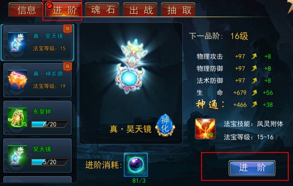 只有让法宝进阶到更高的等级才能让法宝技能得到更好的提升。神化可以让法宝进阶,提高法宝给你的属性哟。