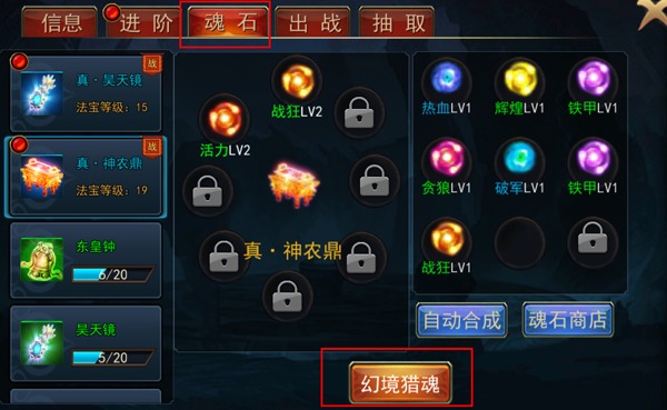 猎魂。幻境猎魂中获取优秀魂石,镶嵌到法宝处可以让法宝附带更多属性,更加强力呢。