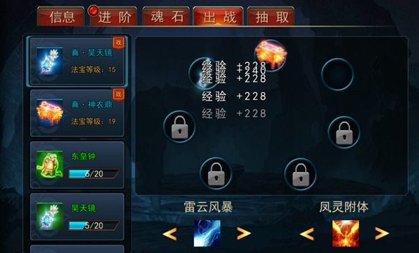 在信息界面你可以查看法宝技能给你带来的技能并提升它,合理搭配技能可以使你更加强力。