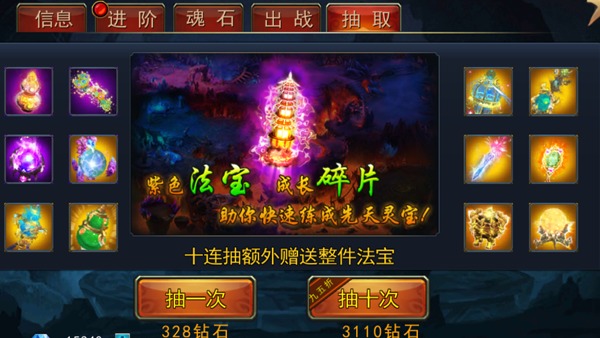 抽取法宝会是快速获得法宝的途径哟。运气好,你还能直接获得最强悍的金色法宝哟。
