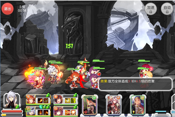 主角属性栏:主角头像下红色为生命值,耗尽则会战斗阵亡;下方为SP值,在战斗过程中SP缓慢增加,使用魔卡也会大幅增加。当魔力值集满时,头像会有高亮,点击能够释放华丽的职业专属特技!伙伴属性栏:四个一同出战的伙伴状态,每位伙伴有两个技能,技能冷却时间重置后会自动释放!魔卡栏:每隔数秒,事先编组的八张卡牌之一会浮现在此,最多同时存在四张。每张魔卡都会有自己的发动效果,如造成伤害、BUFF⁄DEBUFF等,点击发动,长按某张魔卡可查看详细效果。EX条:每次使用魔卡,都会集赞一格EX能量,当蓄满时再使用魔卡,在本身的EX效果之外还会伴随特效,发动展示大幅卡面的特殊EX效果!