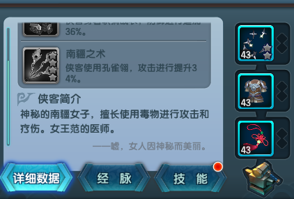 侠客可在战斗中施放大招!每个侠客有3个主动技能,2个被动技能。这些技能的作用各不相同,有的是纯攻击性技能,有的则附加控制类的效果(比如眩晕啦,点穴啦)。而被动技能,有的是加强侠客的属性,有的则是增加侠客的特殊效果。