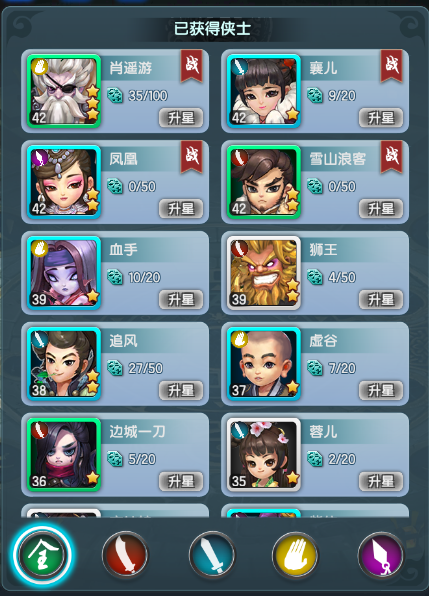 当侠客信物数量满足升星条件的时候,点击侠客界面的升星按钮进行操作,侠客就能完成升星了!每进化一次,侠客可以获得1颗星星。最高可以成长为5星。