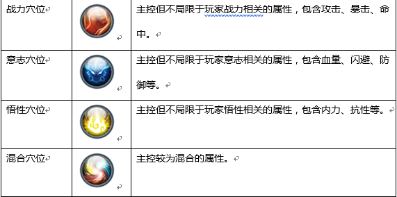 侠客的经脉穴位分为四类:战力穴位、意志穴位、悟性穴位、混合穴位。