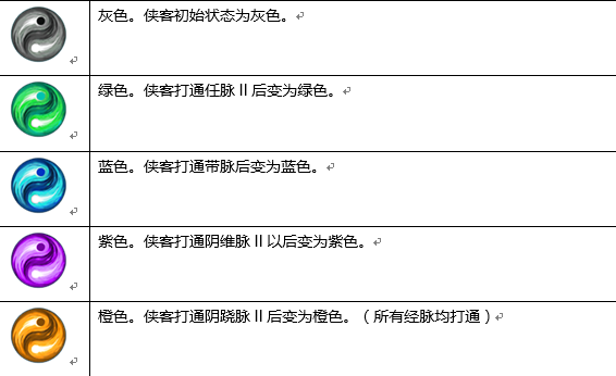 随着侠客穴位的激活,侠客的品质颜色(头像框)会逐渐进行改变,表示侠客进行了一个阶段的提升。经脉界面的八卦颜色将反映这个变化。