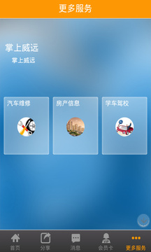 掌上威远APP衣食住行任你查;购物礼品券,想拿就拿;还有美容美发,休闲娱乐,金融理财大大小小各种便利,还等什么,快让整个威远都掌握在手中吧。