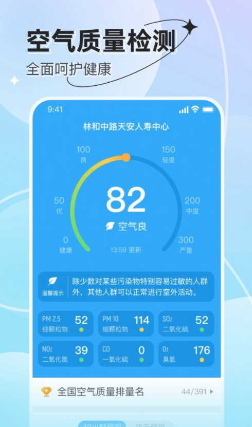 提供气象趋势分析、空气质量指数、日出日落时间等实用功能