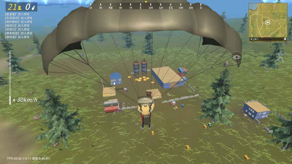 1、从飞机上跳下来之后,将视角尽可能的水平对向目的地,基本上维持在130左右的速度前进大概1Km(一般在900m-1.2Km之间)之后降落伞就会自动打开,之后你能够前进的距离就和你打开降落伞之后所维持的速度有关了