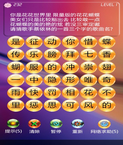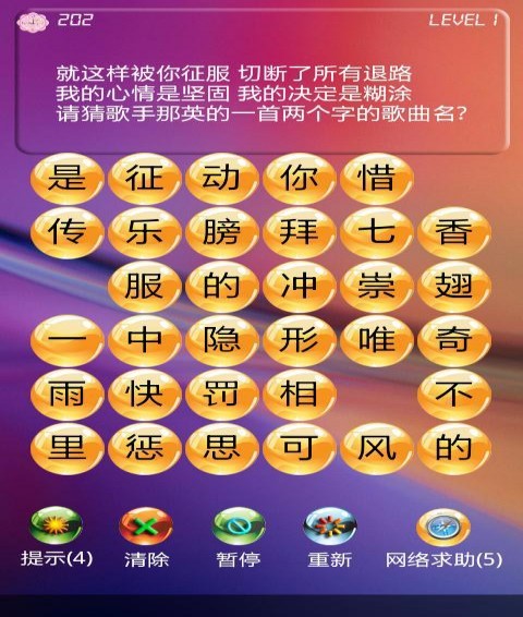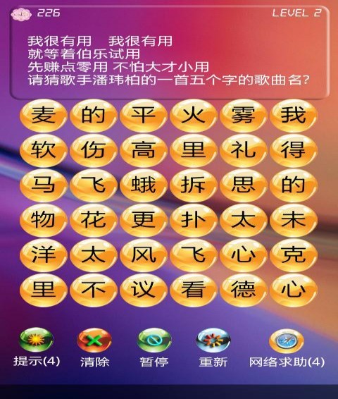 《我爱猜歌词》根据同名节目研发打造而来的音乐益智类游戏APP,在这里你需要专心聆听每首歌曲的一个片段,当音乐停止后,玩家从给出的答案中选出下一句歌的歌词即可过关,软件包含了几百首歌曲的关卡,你知道的歌曲多吗?是记歌词的高手吗?是的话就快来挑战吧!游戏玩法:在猜歌名的过程中,答题是获得金币最直接的方式,每答对一题就可以获得20个金币,不过要是想去掉候选区域的一个错误答案,和获得一个正确答案的文字提示