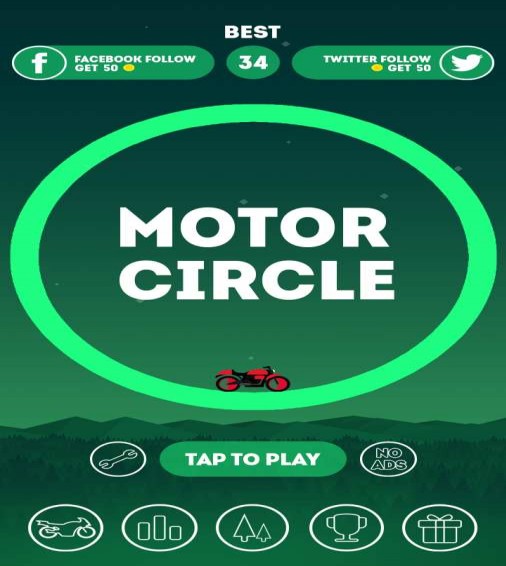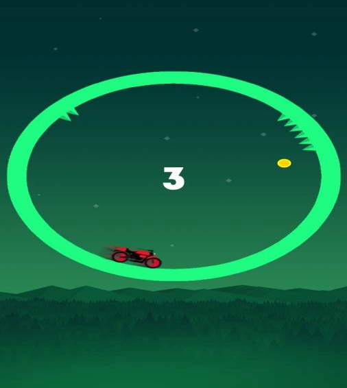 《摩托铁圈赛》是一款益智游戏。在游戏中玩家需要控制摩托在这个圈圈里一直转。游戏里玩家可以通过点击屏幕来让摩托车跳跃,当然这个铁圈别不是那么简单,在玩家完成一圈后会刷新出铁刺若玩家碰上游戏就会结束。玩家还可以连上脸书与推特和其他玩家比一比等分。