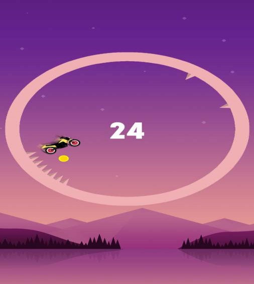 摩托铁圈赛是一款摩托车玩法的手游,摩托铁圈赛游戏里玩家可以通过点击屏幕来让摩托车跳跃,当然这个铁圈别不是那么简单,在玩家完成一圈后会刷新出铁刺若玩家碰上游戏就会结束。