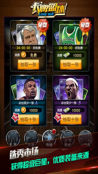 游戏中所有球员数据都是来自于美职篮赛场,球员的技能,球员实力根据该球员上赛季的赛场表现而进行评级。由低到高分别为D-C-B-A-S,球员可以通过剧情赛、选秀市场获得,想组合任何阵容都随您所意。