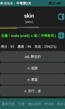 单词闯关是一个让用户在玩游戏的过程中就能背单词的应用。每出现一个新词,有四个答案可供选择,选对了得1分,选错了,扣3分。有小升初,中考,高考,考研,托福等关口,完成所有闯关即游戏结束。在闯关的过程中,可以选择发音模式,以达到练习听力的目的。新增了闯关的难度设置。