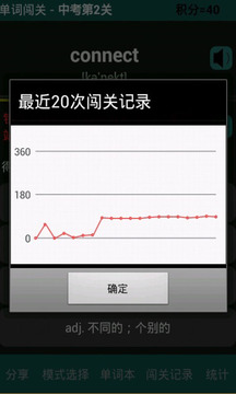 单词闯关是一个让用户在玩游戏的过程中就能背单词的应用。每出现一个新词,有四个答案可供选择,选对了得1分,选错了,扣3分。有小升初,中考,高考,考研,托福等关口,完成所有闯关即游戏结束。在闯关的过程中,可以选择发音模式,以达到练习听力的目的。坚持50天单词闯关,你的单词量就会有明显的提高。