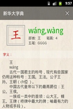 《新华大字典》完善收录了2万多汉字,界面精美,查询简单快捷,同时支持中文,拼音,部首和五笔进行本地查询,同时也百度百科,百度词典和汉典进行网络查询,让您的查询结果更精准.软件完全免费,完全为方便大家开发!