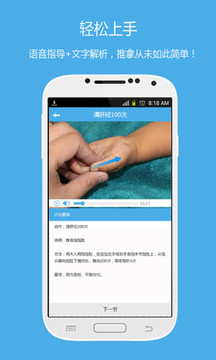 界面简洁大方,操作简单,语音指导+文字解析的方式让你轻轻松松学会推拿!多种播放方式任你选择,再也不怕跟不上了!