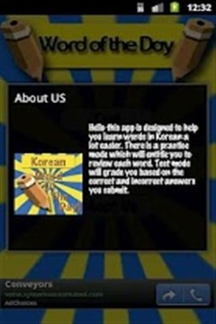 这是一款学习韩国语言的应用程序,这款韩国语言的设计让学习语言变的轻松容易有趣,包含测试模式和实践模式。希望您会喜欢。