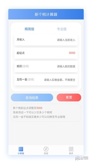 app有精简版和专业版两个计算器模块,专业版可以对社保基数和公积金基数进行自定义输入,用户可输入自己当前的五险一金基数来得到计算结果。